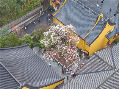 超过500岁的古玉兰,是杭州年纪最长的玉兰树。每年盛花时,硕大又洁白的花瓣与一串串红色小灯笼,交相辉映。树下站满从城市四面八方慕名赶来的游人,端着相机寻找最佳拍摄角度。除了法喜寺,余杭径山寺也有两株古玉兰,树龄分别是315年和205年,花开朵朵素雅白净,幽香阵阵沁人心脾。
