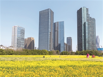 金黄油菜花海与远处的摩登大厦相映成趣,还有几只巨型草莓熊点缀其中。这片花海是免费开放的,地铁直达,交通非常方便。