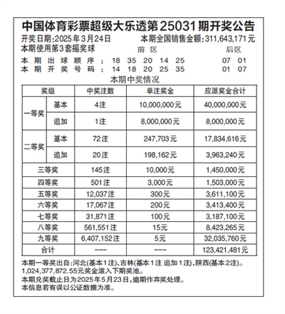 中国体育彩票超级大乐透第25031期开奖公告