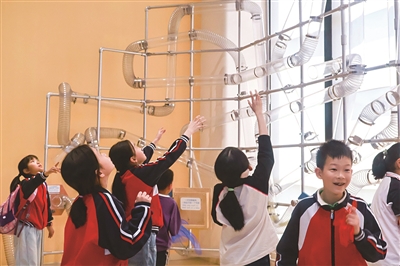 在萧山云探索馆,三年级的学生在讲解老师带领下,开启了一场充满惊喜的科学探索之旅。“用鼓风机吹两个气球的中间,气球为什么没有分开?”“水花纹为什么一会变小一会变大?”一个个问题,一次次思考,学生们在玩乐中感受着科学的奥秘。