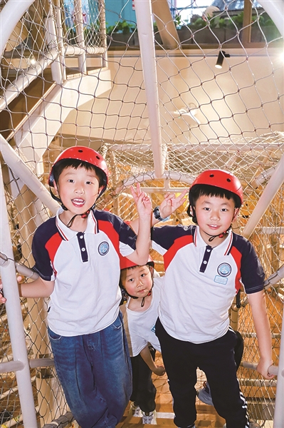 最受孩子们欢迎的是贯穿三个楼层的攀爬架,戴着安全帽的学生,三三两两地结伴而行,他们相互扶持,相互加油,在终点的那一刻,为战胜自己欢呼。