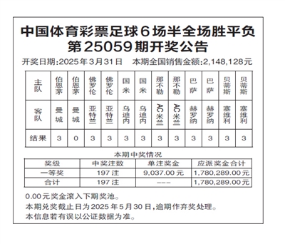 中国体育彩票足球6场半全场胜平负 第25059期开奖公告