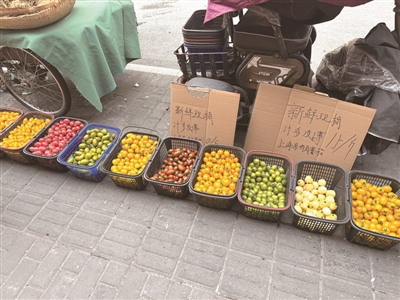 昨天,记者经过孩儿巷的一家炒货店,看到店门口摆了20多个小筐,里面放了黄、红、绿、白等许多颜色的小番茄,标价15元/斤。陆续有路过的人被这琳琅满目、颜色漂亮的小番茄吸引,挑选了一些想尝尝鲜。