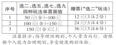 在浙江省内购买“快乐8”游戏“选二”“选五”“选七”“选九”四种玩法,单张票面值超过50元(含)即可获赠“选二”玩法赠票: