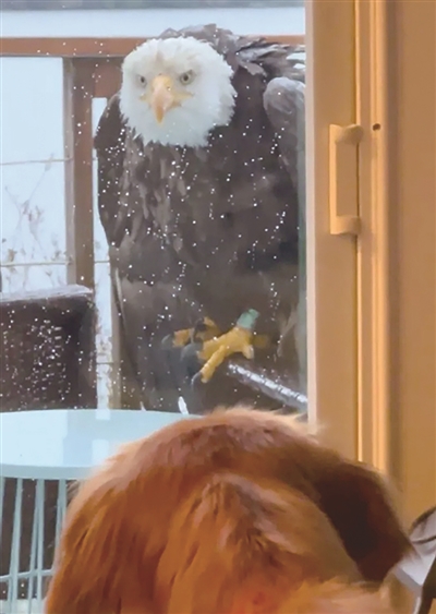 近日,家住华盛顿的史黛西·格斯和家人突然发现窗外来了一位不速之客——一只“美国国鸟”白头海雕。这只白头海雕一直盯着屋内看,吓坏了宠物狗。史黛西的丈夫发现,白头海雕的脚上有一个标记。这意味着,野生动物机构正在追踪。大约对着屋里盯了一天,它最终飞走了。后来,这一家人从野生动物机构方面得知,这只白头海雕可能是吃了一只鹿,撑到飞不动了。