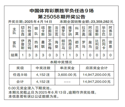 中国体育彩票胜平负任选9场 第25058期开奖公告