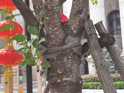 昨天,橙友hfe在橙柿互动App“求助建议”论坛发帖:润园街上润园桥边,有几棵行道树,上面绑了一些铁丝和布条。
