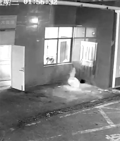 随后,另一段视频显示,男子撞碎玻璃后摔倒在一楼窗户外,起身迅速跑走。