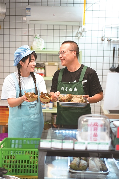 老板娘朱柳青也没闲着,动作熟练地剥开各种口味的粽子递给驻足的客人。
