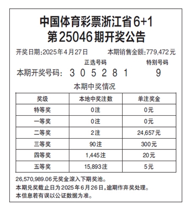 中国体育彩票浙江省6+1 第25046期开奖公告