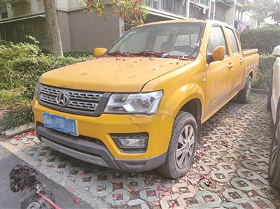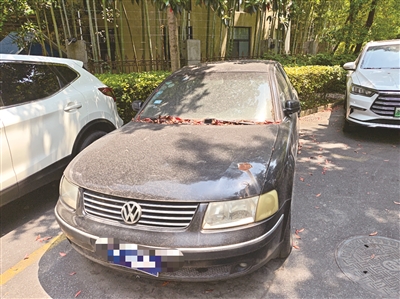 昨天下午,橙柿直通车记者来到了景翠公寓。一进西门,记者就看到了这辆黄色的车子,前面的轮胎已经瘪了。车子的前挡风玻璃上有不少落叶,车子前面微微破损,车顶也落了不少灰。