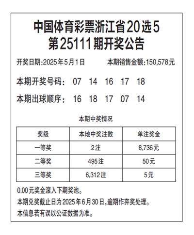 中国体育彩票浙江省20选5 第25111期开奖公告