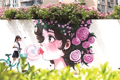 在路的北侧,有一面白墙,白墙内的月季正在盛开。在五处月季最茂盛的地方,有五个卡通女孩的头像。