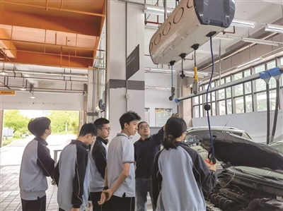 实境研学环节中,学生来到了汽车工程技术应用中心长安福特产教融合基地。汽车工程学院副院长魏志宁向同学们介绍了新能源汽车的基本结构。魏院长告诉大家,新能源汽车就是会奔跑的“钢铁侠”,它的动力电池就是它的心脏,电路系统是遍布全身的神经网络,而方向盘则是钢铁侠的“意念控制器”。