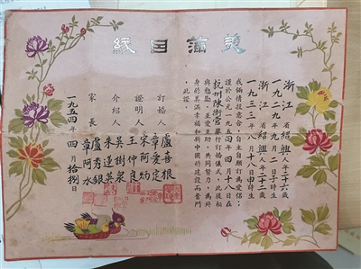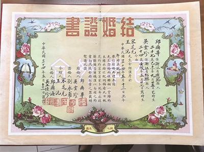 五颜六色的雕饰配图,工整秀气的手写字样,“同心永爱”的美好誓言。这是一张民国二十八年(1939年)的结婚证书。