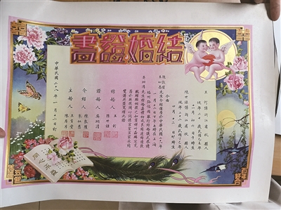 “1939年,父母喜结良缘,在这张结婚证书上,除了他们两个人的名字和年龄外,还记载着介绍人、证婚人、主婚人的信息。可以说,是一张相当详细的结婚证书了。”陈大伯说。