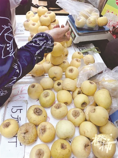 这位摊贩售卖的“冬厘果”有三个价位,从橙友发布的图片发现,三个价位的果子在大小上相差不大,最便宜的(15元/斤)果子品相差一点。果子形状像苹果,颜色像梨,底部都有一圈棕色的印子,但具体是苹果还是梨,不得而知。