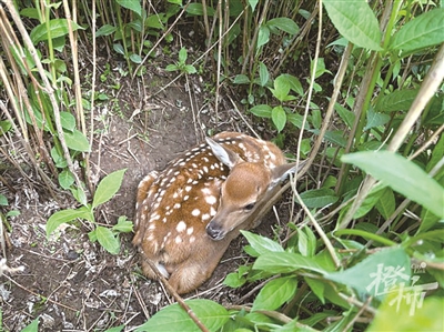 老章说,鹿妈妈可能就躲藏在附近。发现人类或其他动物过来,机警的鹿妈妈会让小鹿躲起来,然后主动跑开,因为自己目标大,容易被发现,小鹿就会安全。周围安静没危险了,或者很隐蔽的情况下,鹿妈妈分泌了很多乳汁,乳房会涨起来,就会找到小鹿给它喂奶。小鹿肚子饿了,在安全情况下也会跑出隐藏地,呦呦叫着去找妈妈。