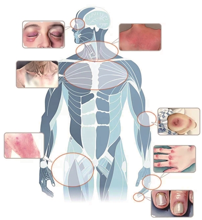 肌肉炎症性疾病的几个典型皮肤症状 患者双侧眼眶四周出现紫红色或暗红色红斑,表面有轻微脱屑,有点像醉酒后的面容,在太阳下暴晒后症状可能会加重。是不是有点像日光性皮炎? 患者脖子领口部分出现“V”字形的红色皮疹,或者脖子后面肩膀部位出现红色皮疹,是不是很像在海边晒伤的样子? 患者双手手背指关节、肘部、膝盖等骨骼突出部位出现紫红色或暗红色扁平丘疹或斑块,表面覆盖细小鳞屑。 患者皮肤上出现黑一块白一块的色差,前胸和手臂色差比较明显,时不时还会发痒。是不是像色素沉着? 患者臀部和大腿侧面出现红色或紫红色皮疹。 制图 高薇 患者指甲盖根部和皮肤连接的地方出现皱裂,可见不规则增厚。根部皮肤出现血丝。 图一 上面这几张图片展示的,都是一些肌肉炎症性疾病患者的典型皮肤症状,是不是很容易和日光性皮炎、湿疹、特异性皮炎等搞混?