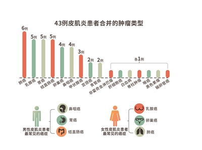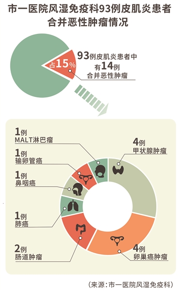 “在治疗肌肉炎症性疾病,比如皮肌炎时,一旦出现传统免疫治疗效果不佳的情况,我们一般会建议进行肿瘤相关检查。”黄佼说,从他们临床上接诊的情况来看,有不少肌肉炎症性疾病患者存在合并恶性肿瘤的情况。恶性肿瘤出现在肌肉炎症性疾病诊断之前、同期或之后都有。