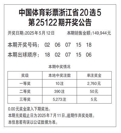 中国体育彩票浙江省20选5 第25122期开奖公告