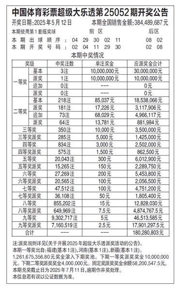 中国体育彩票超级大乐透第25052期开奖公告