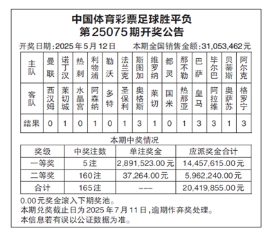 中国体育彩票足球胜平负 第25075期开奖公告
