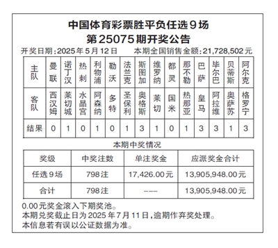 中国体育彩票胜平负任选9场 第25075期开奖公告