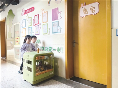 去年,一批小兔子进驻杭州市钱塘外语学校,学校专门开辟了一个“萌兔疗愈空间”,由各班同学轮流亲历兔子饲养、兔屋清洗等劳动实践。