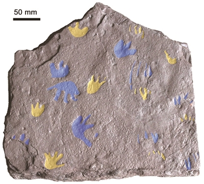 这块约35厘米长的砂岩化石出土于澳大利亚墨尔本附近布罗肯河畔,覆盖有17个长度为3到4厘米的脚印。这些脚印无论整体形状、脚趾长度还是爪痕,都符合爬行动物爪子的典型特征。研究人员由此推断这是爬行动物祖先留下的足迹,并用多种方法测定化石年代为约3.5亿年前。