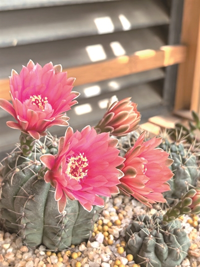 橙友“西湖之牛”家中阳台的仙人球花争相斗艳,一朵粉红一朵洁白,惹人喜爱。橙友“老愚”家的一盆仙人球密集开出了十几朵红艳艳的花。橙友“零度阔落加冰”家的仙人掌在根部开出了一朵黄色小花。橙友“楚卉”发帖分享:“妈妈养的仙人球,这么小的一棵,居然都能开花,秘诀就是多晒太阳。”