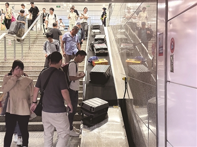 不少旅客把行李放在传送带上后,还不忘拿出手机拍个照或是拍一段小视频。几秒钟之后,行李箱就会通过传送带从楼梯的上方到达下方,这时旅客也刚好从楼梯上走下来,从传送带上取下行李箱。