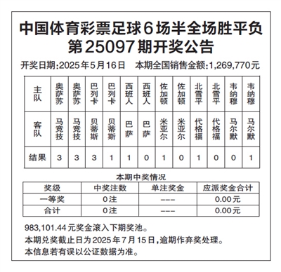 中国体育彩票足球6场半全场胜平负 第25097期开奖公告