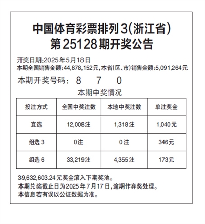 中国体育彩票排列3(浙江省) 第25128期开奖公告