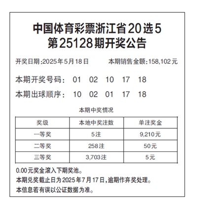 中国体育彩票浙江省20选5 第25128期开奖公告