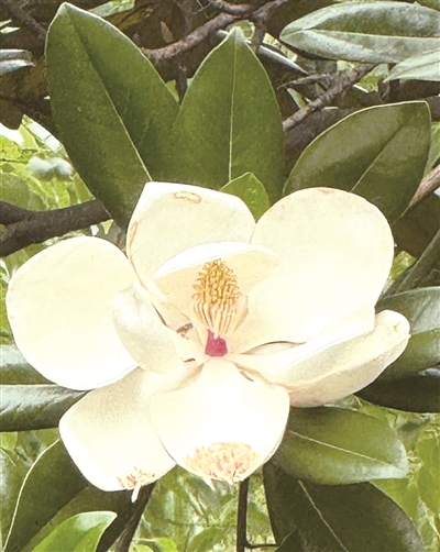 广玉兰是漂洋过海来中国发展的常绿乔木,原产于美国的东南部,在中国,它主要分布于长江流域以南各城市。广玉兰辨识度十分高,给人的印象就是大,株型魁梧。盛开时花的直径可达30厘米,花色洁白、花香满溢。花被片9-12枚,倒卵形,花丝扁平,紫色。叶片也挺大,长20厘米、宽12厘米左右,正面光滑浓绿、背面密被褐色绒毛,四季常青。