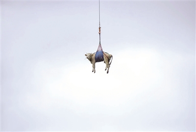 瑞士阿尔卑斯山区一座村庄近日面临山体滑坡风险,紧急疏散人员及牲畜。于是,人们见到一番奇景:一头牛被吊在直升机下方,升空,飞往安全地带……