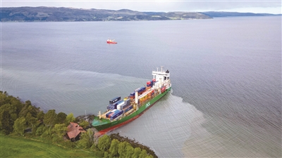 5月22日一早,住在挪威特隆赫姆峡湾比内塞特的约翰·赫尔伯格被邻居叫醒,问他是否注意到“门外有艘船”。当他推开门时,眼前竟是一艘135米长的集装箱货轮,搁浅在他家前院的草坪上。