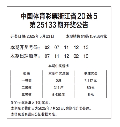 中国体育彩票浙江省20选5 第25133期开奖公告