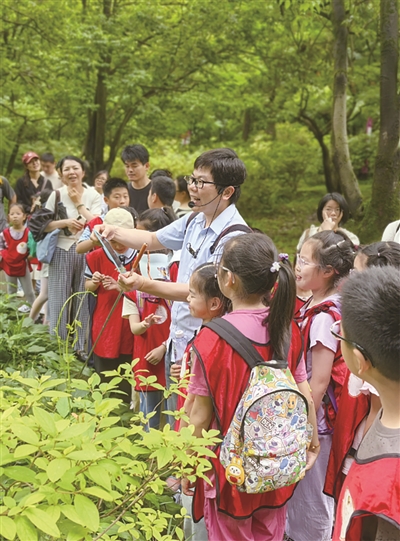 那里是杭州主城区内唯一的国家级森林公园,被誉为“杭州的后花园”。夏日来临,那里植被繁茂,山林滴翠。带领小记者的研学导师,是一位“杭州植物专家”,随便走到一片植被前,就能滔滔不绝地讲个不停,小记者们有任何关于植物的问题,在导师这里都能问到答案。