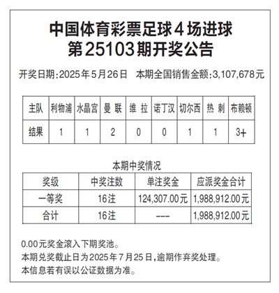 中国体育彩票足球4场进球 第25103期开奖公告