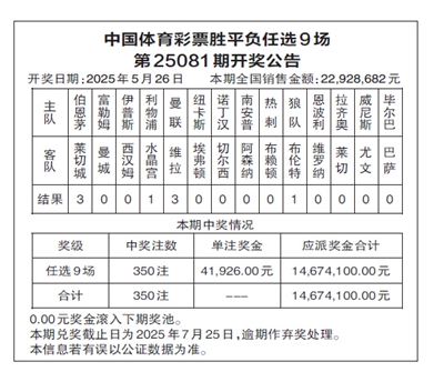 中国体育彩票胜平负任选9场 第25081期开奖公告