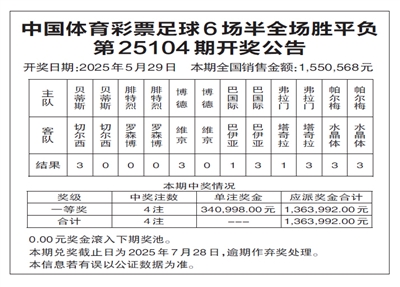 中国体育彩票足球6场半全场胜平负 第25104期开奖公告