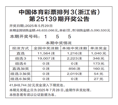 中国体育彩票排列3(浙江省) 第25139期开奖公告