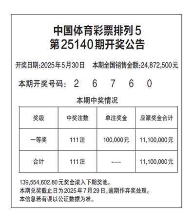 中国体育彩票排列5 第25140期开奖公告