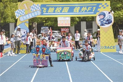 5月30日,学生们自己设计打造的“F1”赛车飞驰在杭州市钱江外国语实验学校的校园里。