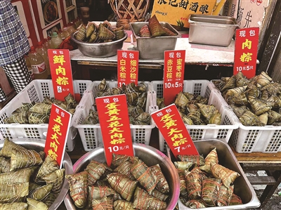 蔡大姐在大马弄做生意已经30年了,卖的都是季节限定,清明节卖青团,立夏前后是乌米饭,她这里的粽子有很多口味,不过最畅销的是蛋黄五花大肉粽(10元/个)和大肉粽(8元/个)。临近端午买粽子的人越来越多,这两天,蔡大姐每天都能卖掉几千个粽子。她也是忙得不可开交,更是从早上6点开始,一直要包到夜里。等到端午节正日子那天,来买粽子的人肯定更多,蔡大姐说,端午节前一天晚上她准备通宵包粽子了。