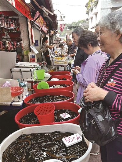 另外一家水产摊位正忙着补货黄鳝,等杀黄鳝的队伍也排了好几号人,老板一边不停地处理黄鳝,一边还开着直播,顾客则是一边排队一边闲聊,有的问家里人:“冰箱里的虾仁还有吗?明天弄点出来爆一爆。”看来这家的端午菜单是虾爆鳝。