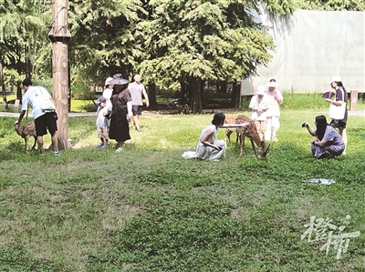 上午10:00,记者在水上森林码头北面找到了鹿园,白色护栏围起,里面有5只梅花鹿,外面有一只悠闲吃草,游客走近伸手抚摸,它一点都不见外,温顺亲人。