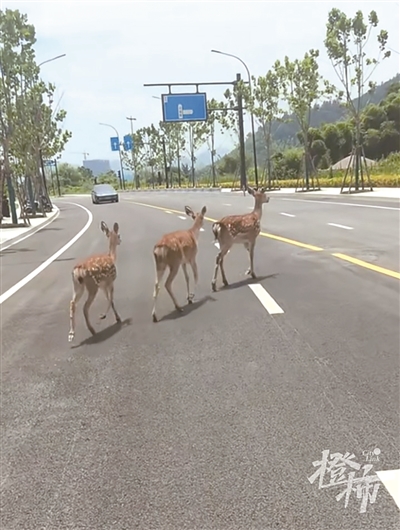 5月31日中午11:59,网友“爬山别跑伤膝盖”在社交平台发帖:在青山湖的公路上看到了3只梅花鹿,警察说是从景区跑出来的。